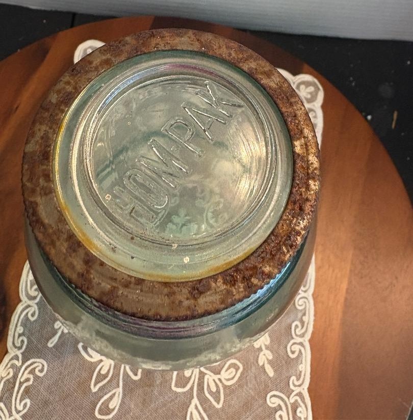 This vintage Ball Mason fruit jar with no shoulders in the 2 quart/1/2-gallon size is in great, used condition for its age. It measures approx. 9 1/4″ tall overall for size reference. There are cracks on the rim that have been repaired and some chips as well. The lid does still screw on. It does have a few bubbles on occasion throughout as well as some wavy glass pattern from the mix when made. It has no markings on the bottom except where the glass was blown leaving a round circle from the break. It is also marked Ball Mason on the front of the jar. On the cap it reads Hom-Pak.