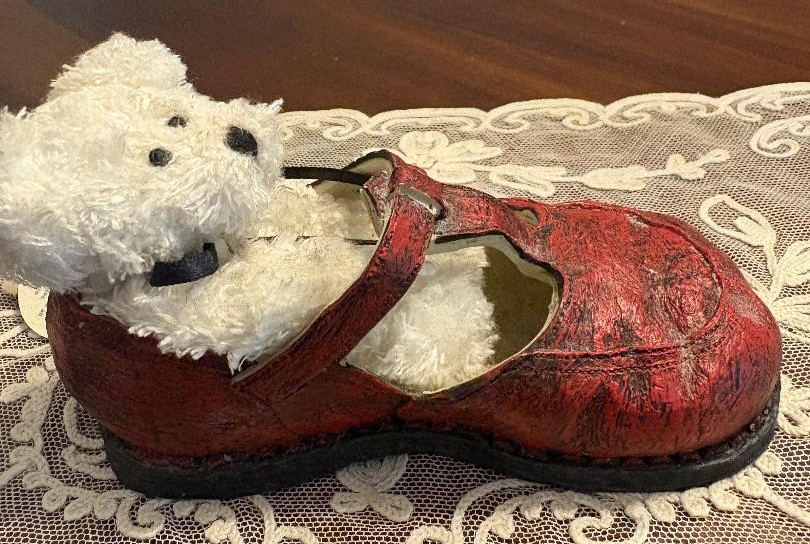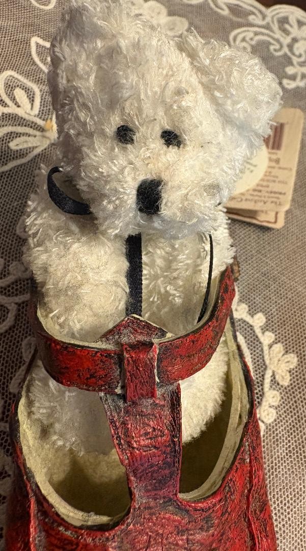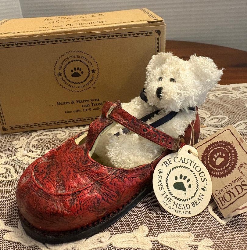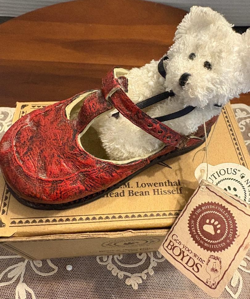 This product is a Boyds Bear-Foot Mini white plush Bear in a vintage red strappy resin shoe. It is a retired item and comes in the original box, making it perfect for your collection or giving as a gift. It is approximately 4 inches in size and is a great gift for anyone who loves Boyds bears or the Bearfoot collection.