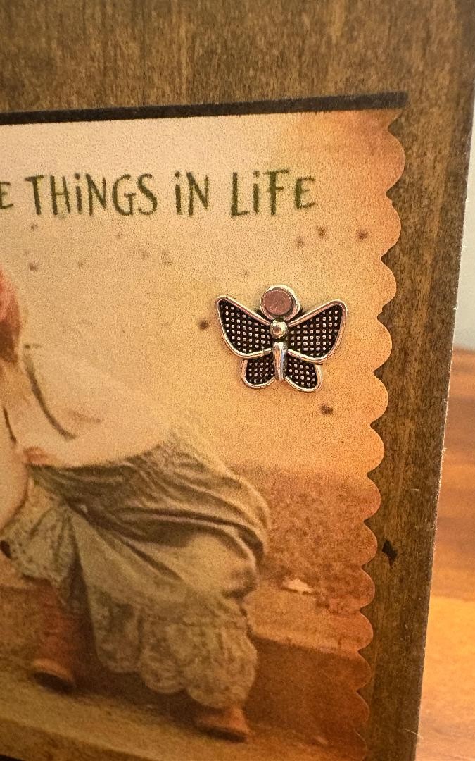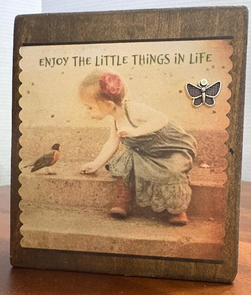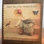 Homemade decoupaged wood shelf sitter depicts a sweet little girl with her little bird friend. “Enjoy the little things in life” This plaque measures 3.5″ x 4″ and has a beautiful charm about it. The decorative butterfly charm makes this piece unique and a great gift or addition to any room. This precious wood decor is handmade and in great shape and ready to sit on your table or shelf.