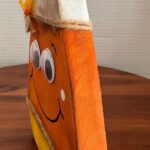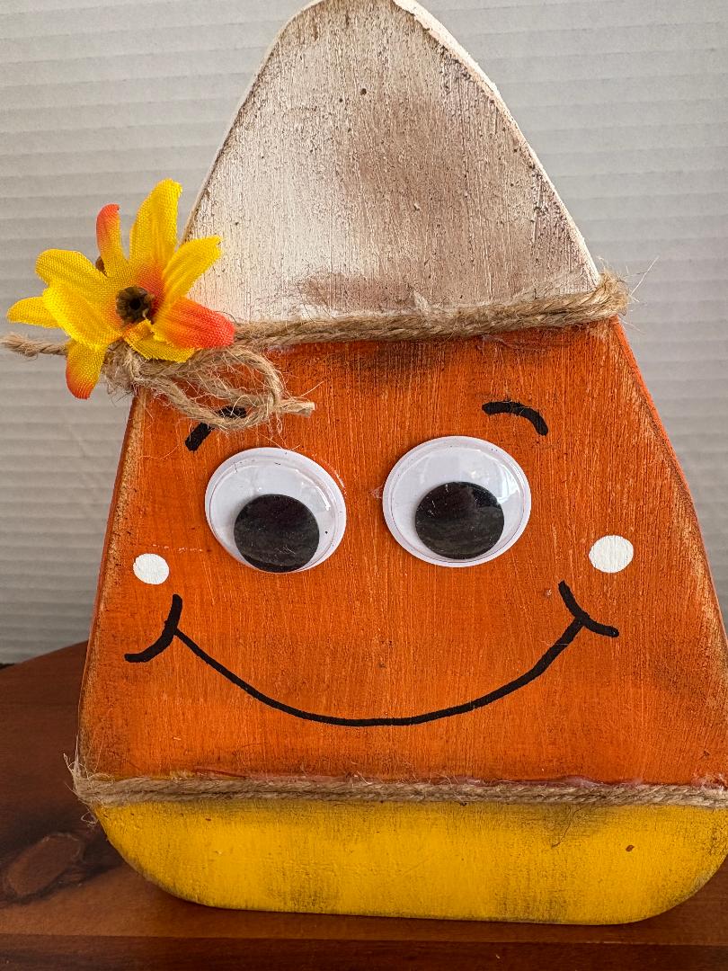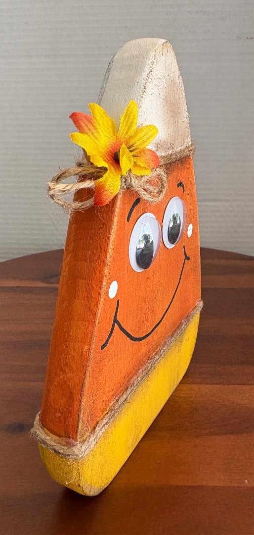 Homemade wooden candy corn shelf sitter that looks so cute displayed around fall and Halloween! Painted in a distressed, traditional white, orange, and yellow color scheme with a flower and cute googlie eyes for a fun touch. Candy corn is freestanding and looks great displayed on a small table or shelf. Pieces measure 7″ high by 5.5″ wide.