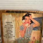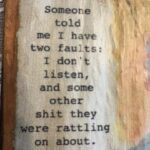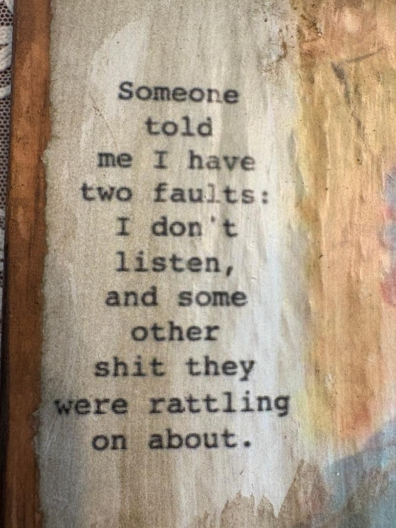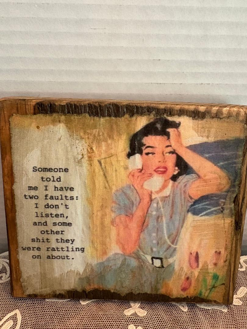 Wooden decoupaged plaque or shelf sitter ” Someone told me I have two faults: I don’t listen, and some other shit they were rattling on about” LOL Funny. Measures 4.75″ x 5.25″