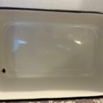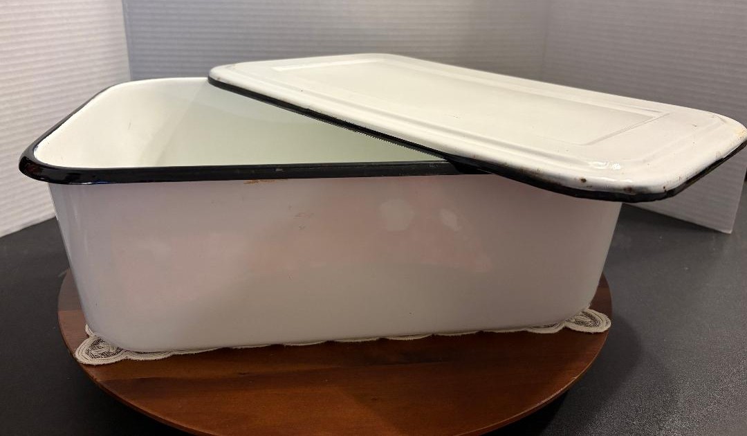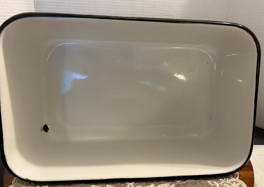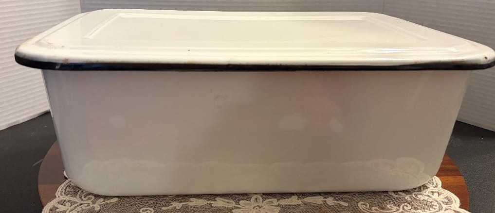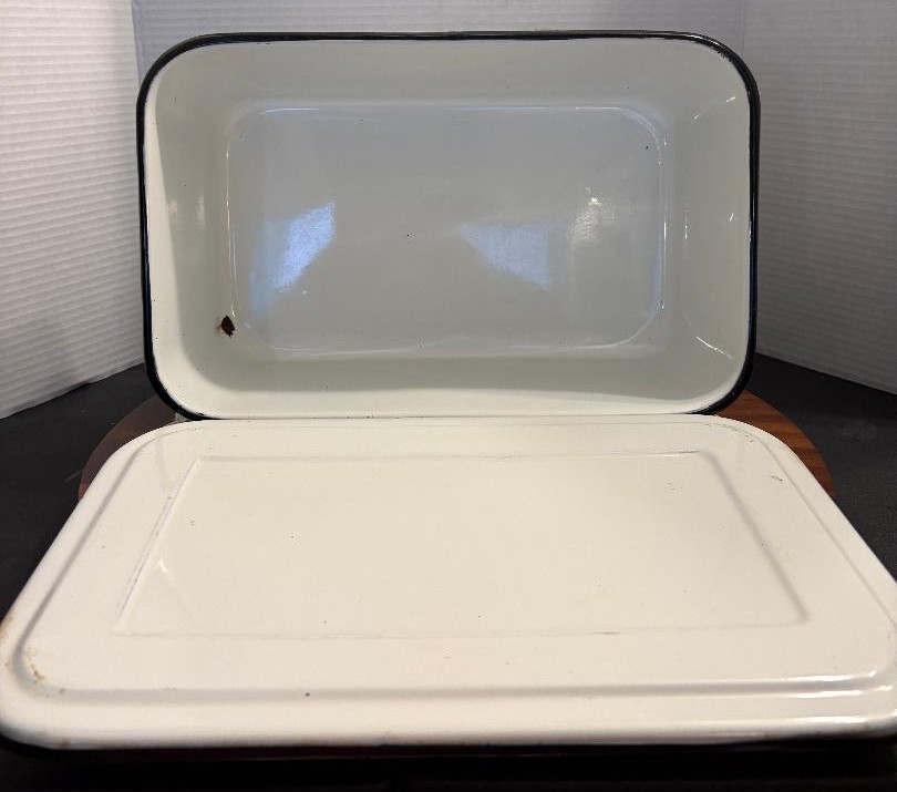 VTG Enamelware Deep Pan Tub White Porcelain w/Black Trim & Lid. This vintage enamelware pan comes with a lid and is perfect to display in your farmhouse kitchen! Measuring approximately 9 x 13 x 5.5″ it is in fair to good condition for its age. There is some staining inside, as well as some chips to the enamel, all of which are typical with this type of pan.