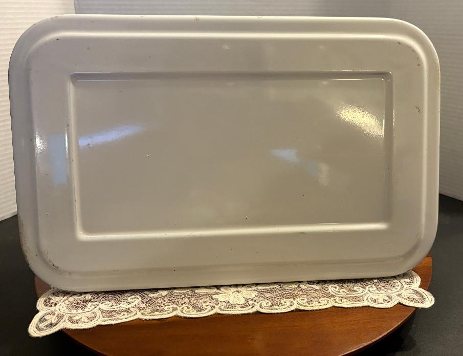 Large Vintage Enamelware Deep Fridge Pan w/Lid Farmhouse 14”x 9.25″x5″