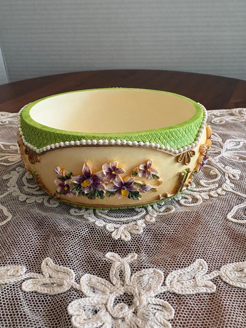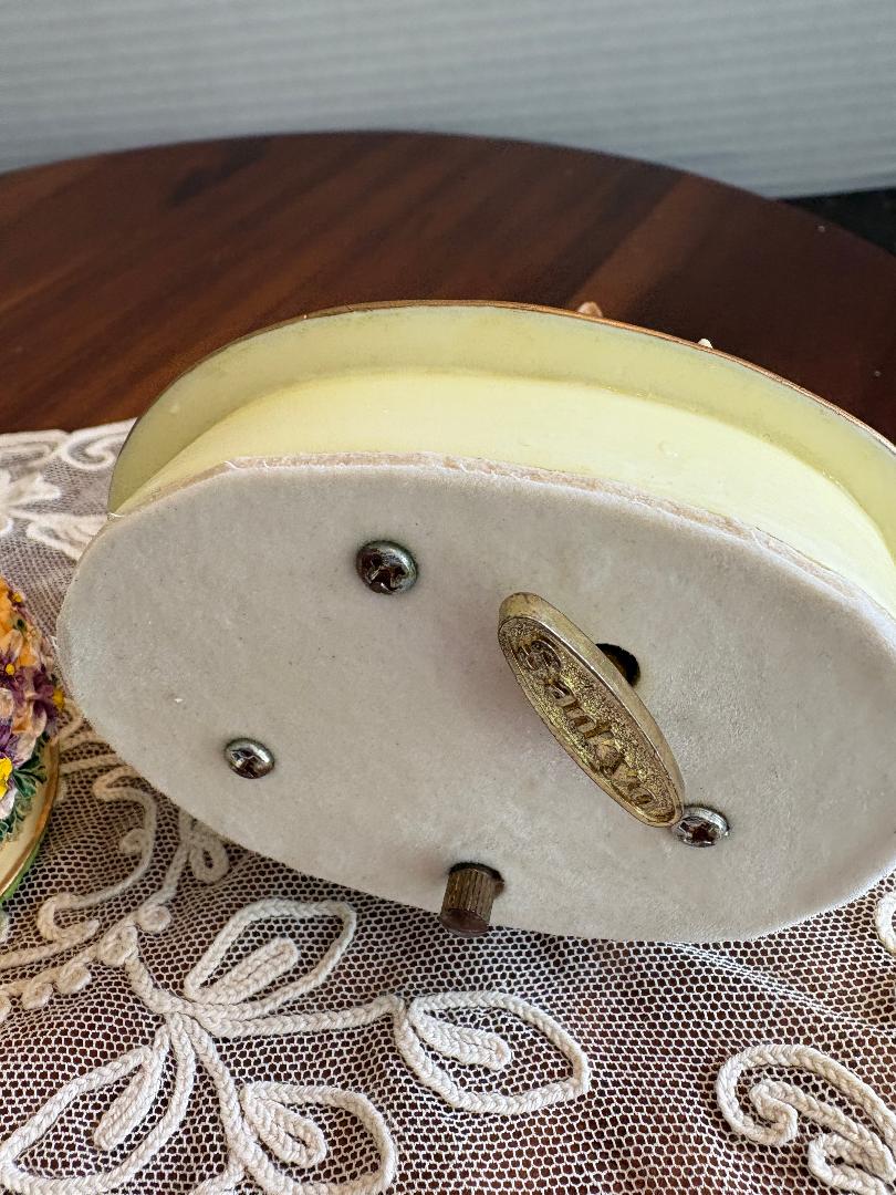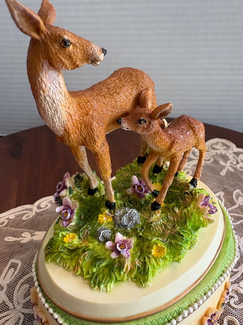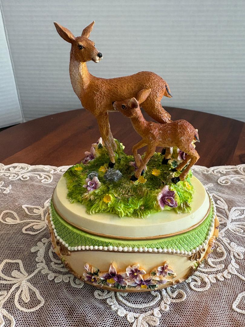 Holsted House charming music box featuring a mother deer and her fawn . The music plays and I believe the tune is part of Love Is A Many Splendored Thing. It is in very good condition. Measures about 5 inches across and about 11 inches in circumference.