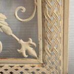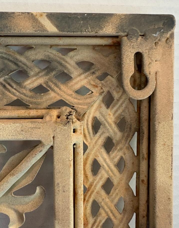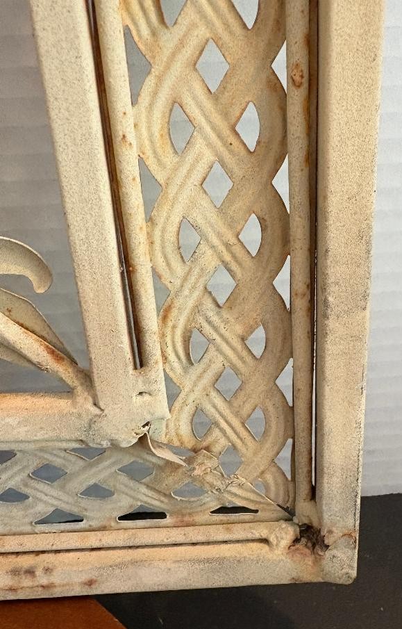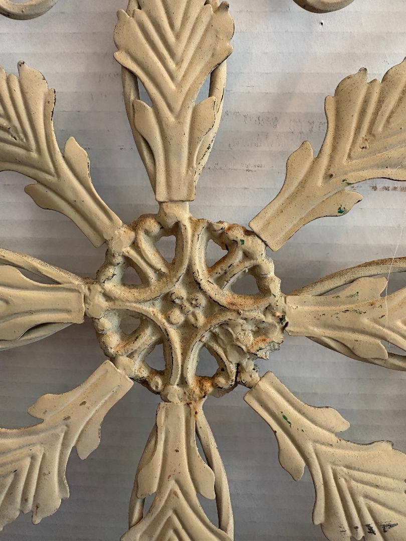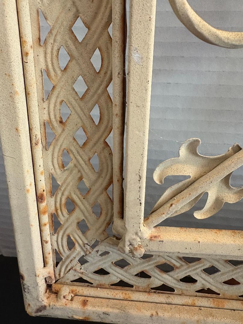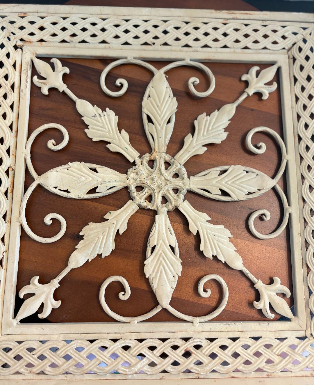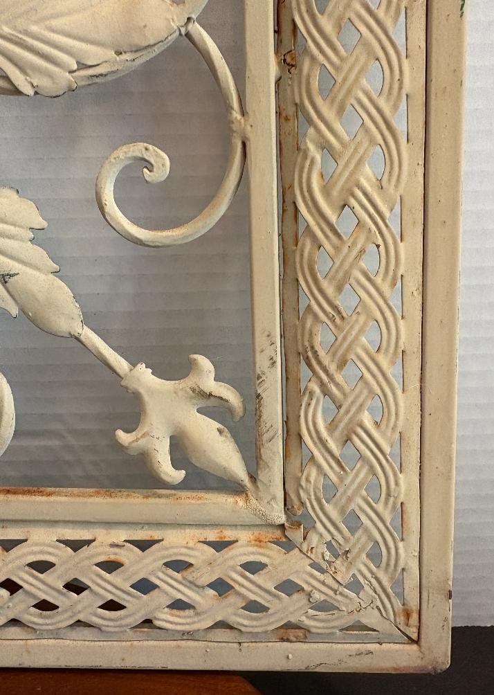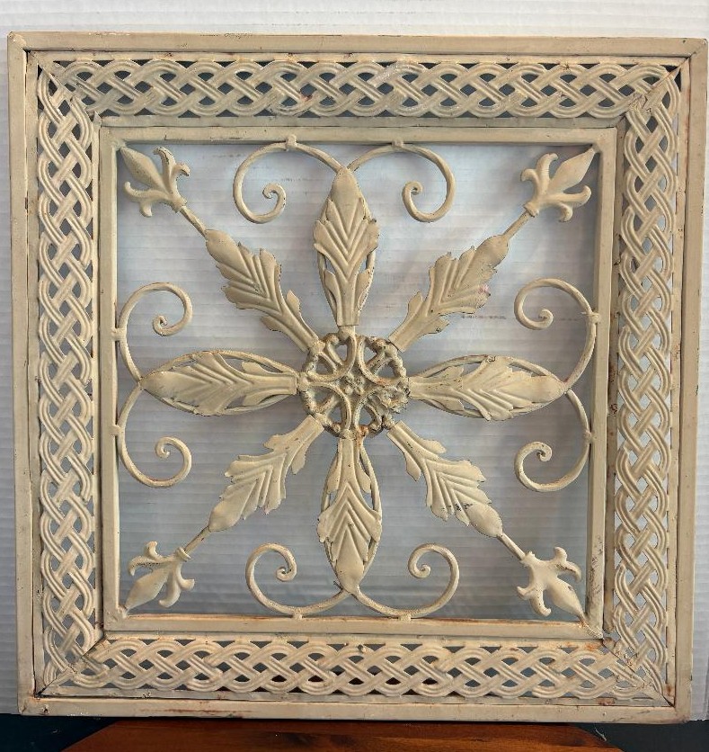 Rustic welded wrought iron and metal hanging plaque that measures 15 1/4″ x 15 1/4″. Great decor to adorn your home walls, garden or patio. This was a lovely addition to my garden and has some rusting spots that adds to the charm of this vintage piece.
