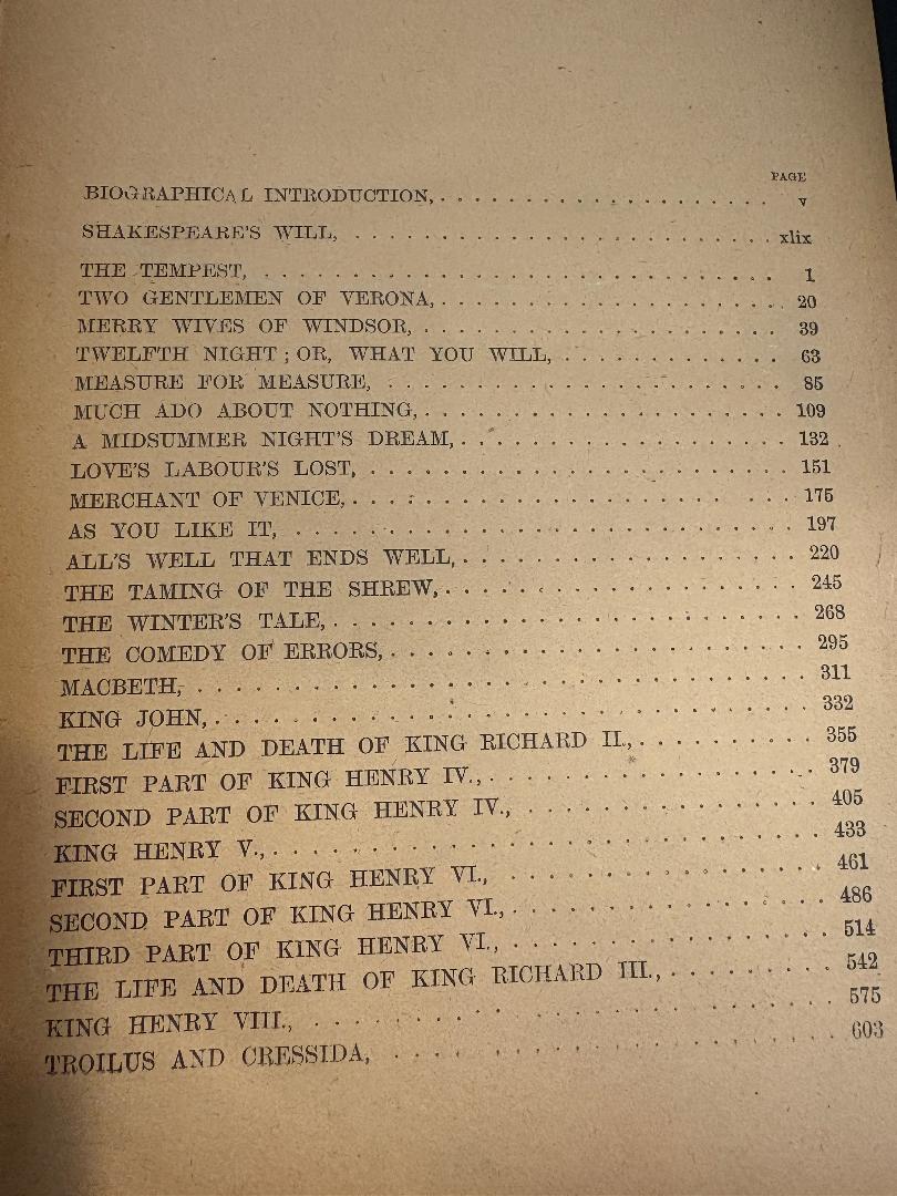 The Complete Works of William Shakespeare unabridged with Memoir and a Biographical Introduction by Henry Glassford Bell illustrated. Also contains William Shakespear’s last will and testament. This book is in fair condition for being 131 years old. This is a hard cover book with a brown cover. Pages have yellowed but are in great shape. The binding needs some minor repair work. Dimensions: 7.0″ X 9.5″ 1,015 pages