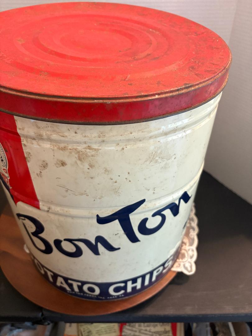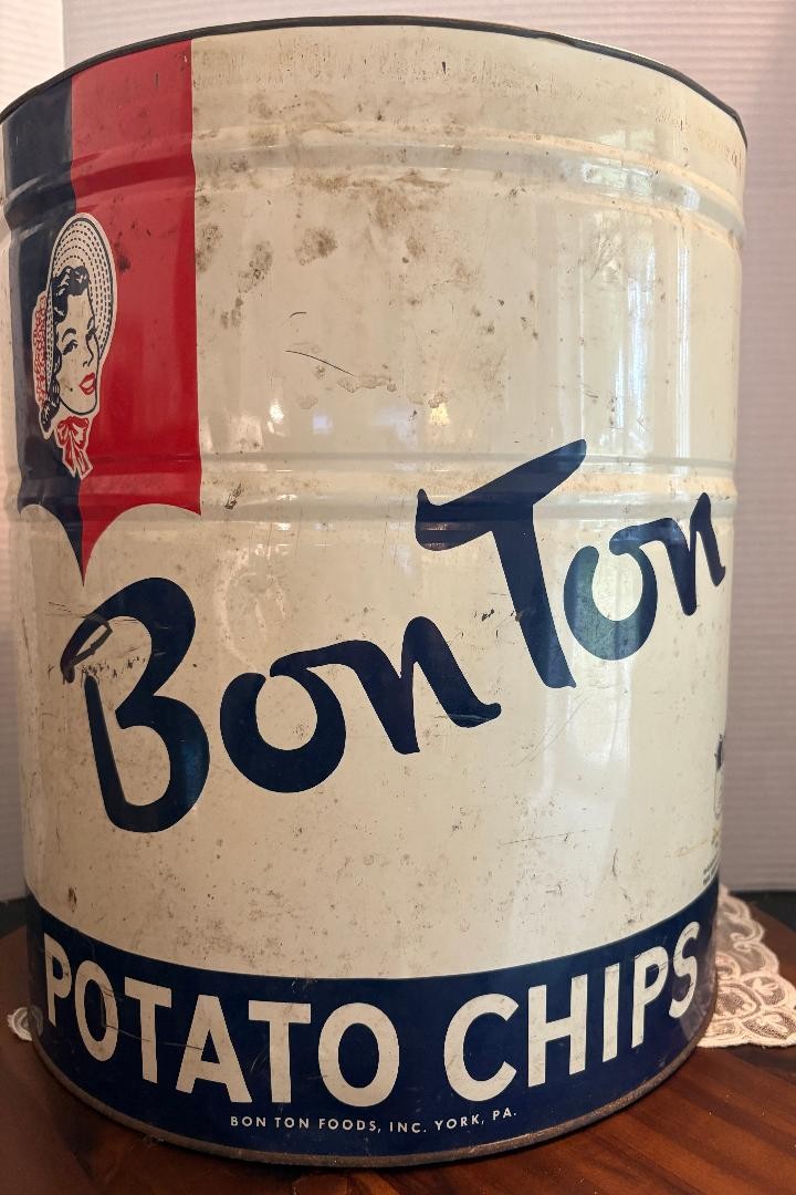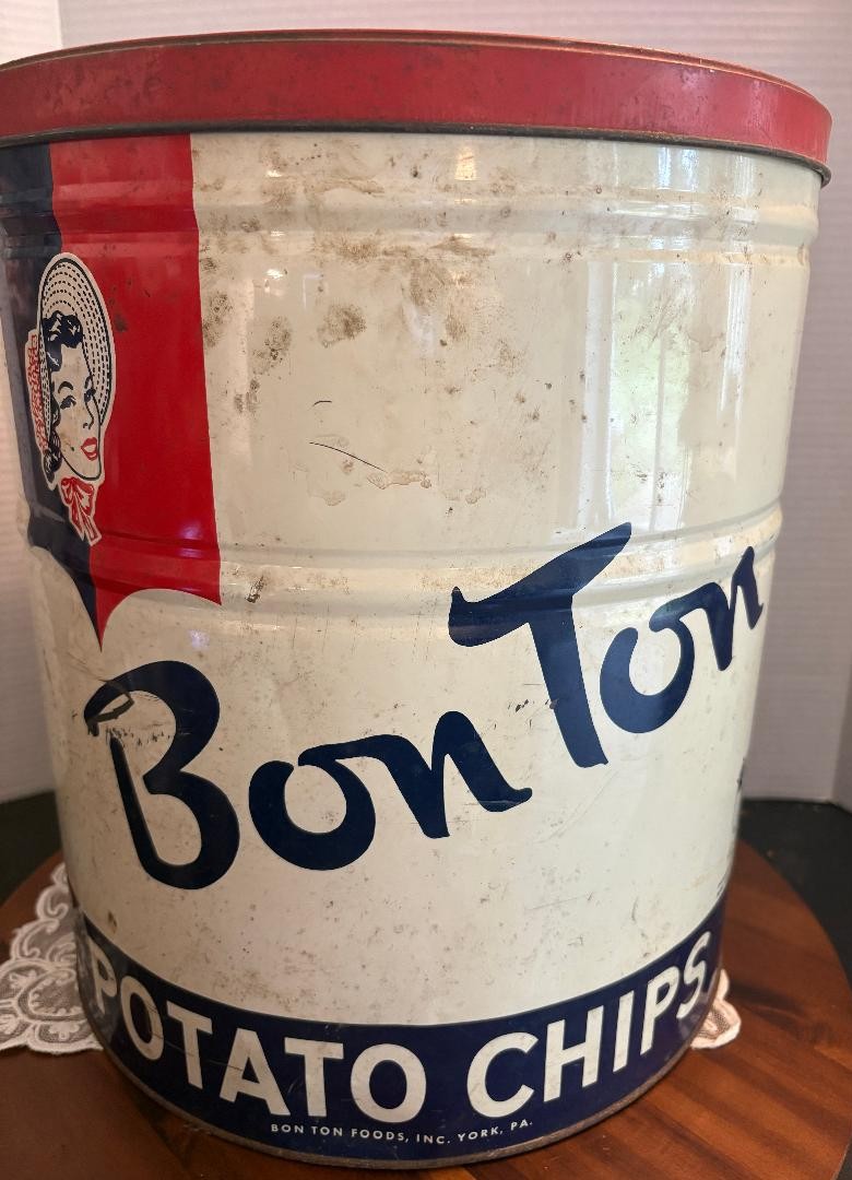VINTAGE BON TON POTATO CHIPS NEW YORK, NY TIN METAL CAN BOX 13.75″ x 12″