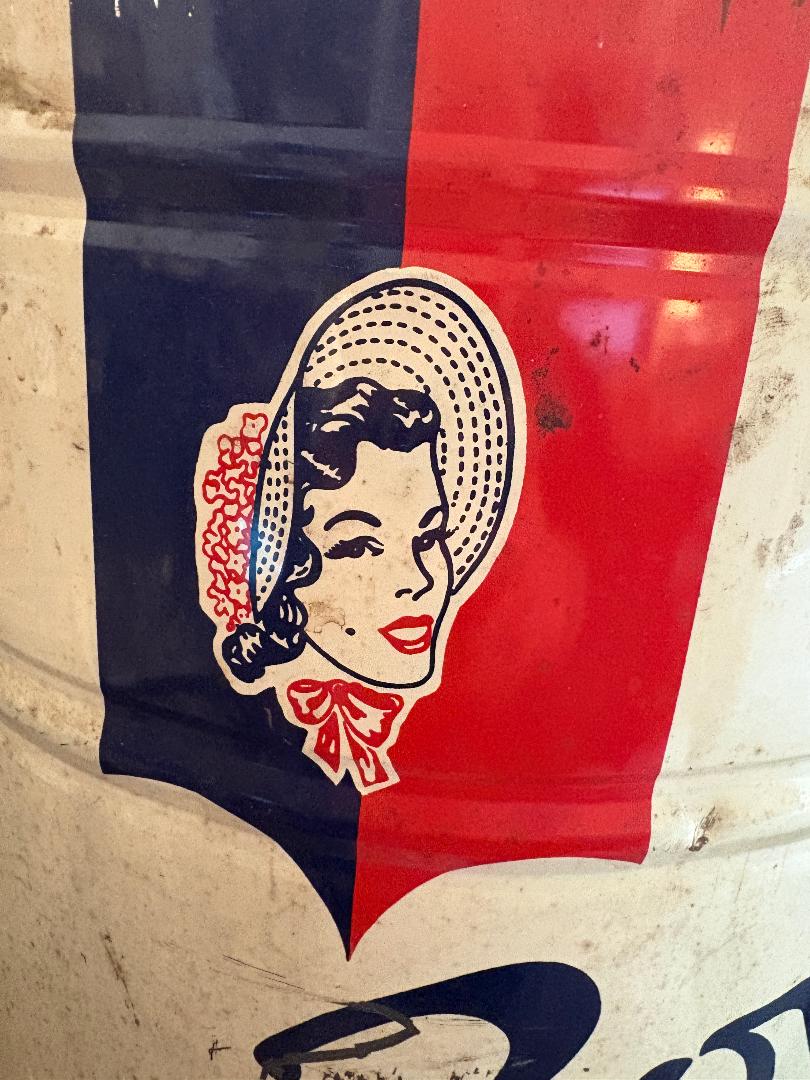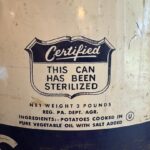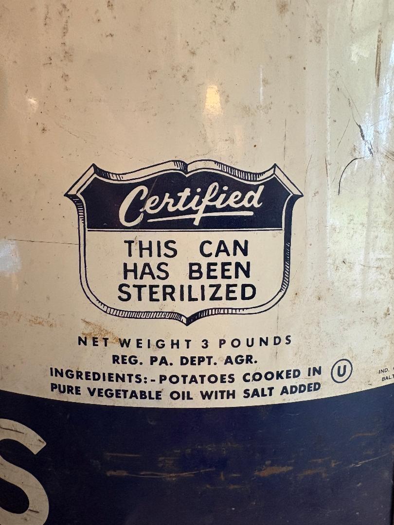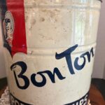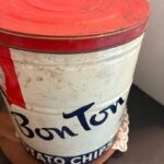 This vintage 3 lb display-sized tin is a must-have for collectors of advertising and merchandise memorabilia. Featuring the iconic BON TON brand and colorful multi-design, this tin is a perfect addition to any collection. Made in the United States, this tin is a rare find and has not been modified in any way. The large vintage tin is perfect for storing your favorite snacks or simply displaying it in your collection. With its unique design and historical significance, it’s sure to be a conversation starter. Don’t miss your chance to own a piece of American history with this authentic BON TON potato chips tin. Good graphics, no big dents, some rust, paint chips & scratches from use. Condition is “Used”.