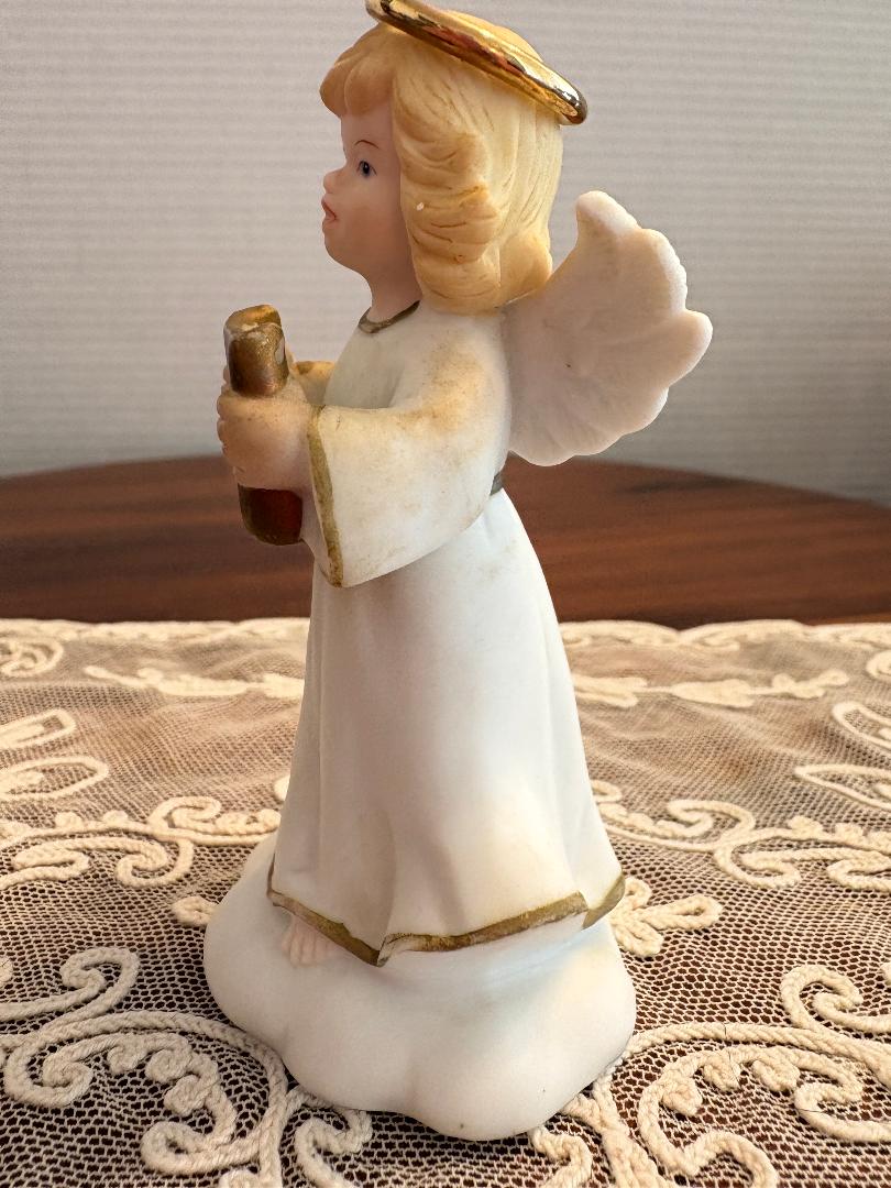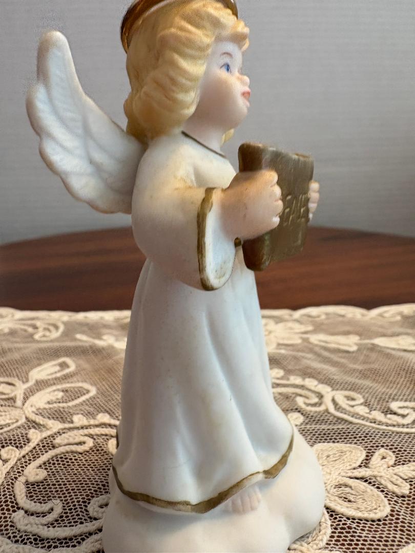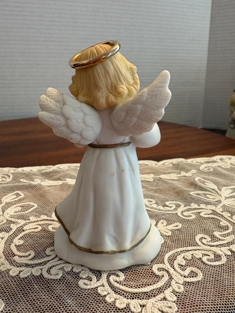 This adorable hand painted angel is a Bronson Collectible in their Golden Halos Series – 1996. She is made of bisque porcelain, painted white with gold trim. Her name is “Peaceful Penelope”, and she is in excellent condition, no issues. Measures: 3-1/2″ tall by 2″ wide