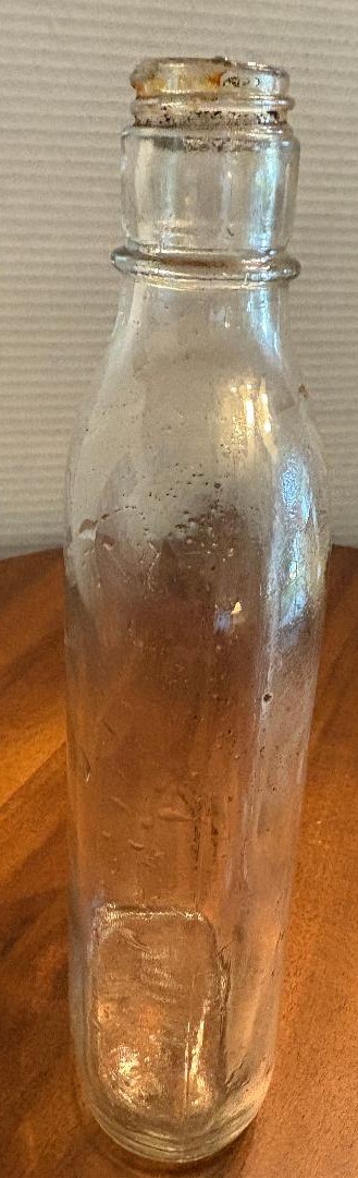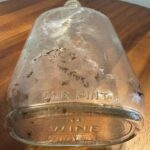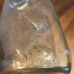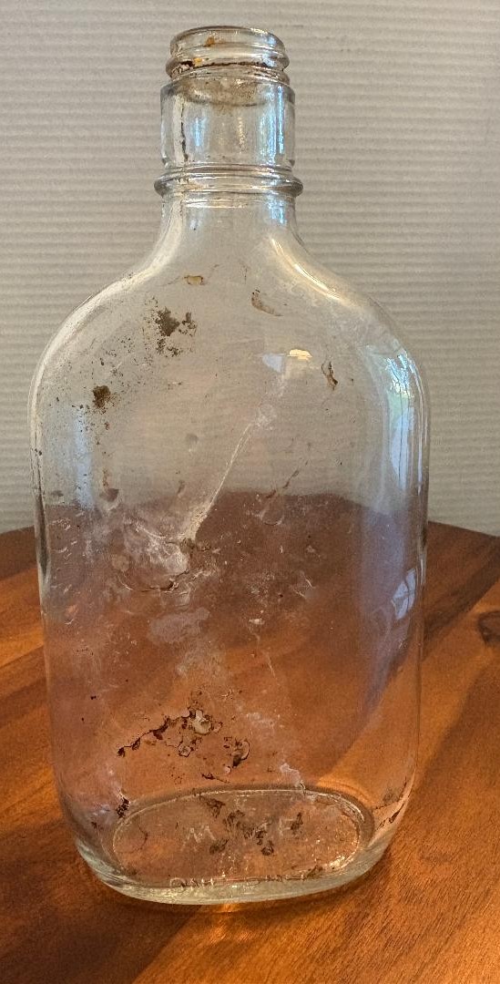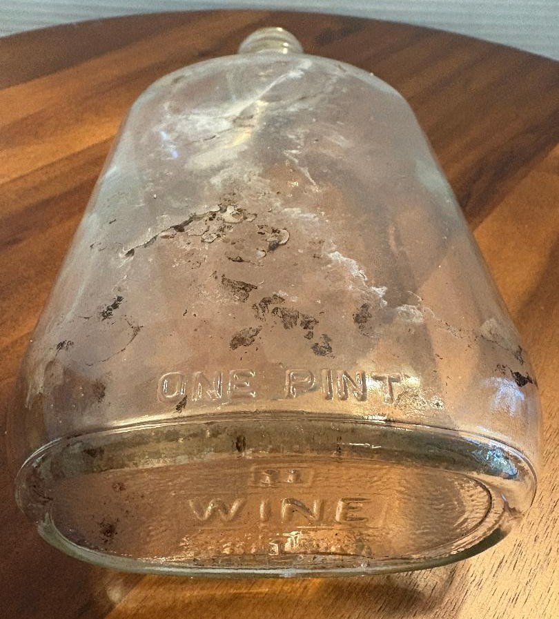 Found buried this vintage one-pint clear glass bottle wine flask is a collectible piece made in the United States. Its elegant design and classic clear color make it a charming addition to any wine enthusiast’s collection. The pint volume and wine bottle type add to its appeal as a functional and decorative item for storing or displaying wine. Perfect for those who appreciate the craftsmanship and history of American-made wine bottles. Screw top clear 8″ (20.32 cm) bottle with some dirt still inside that can be cleaned. No cracks or breakage, features the word “WINE” on bottom and “ONE PINT” on base of both sides.