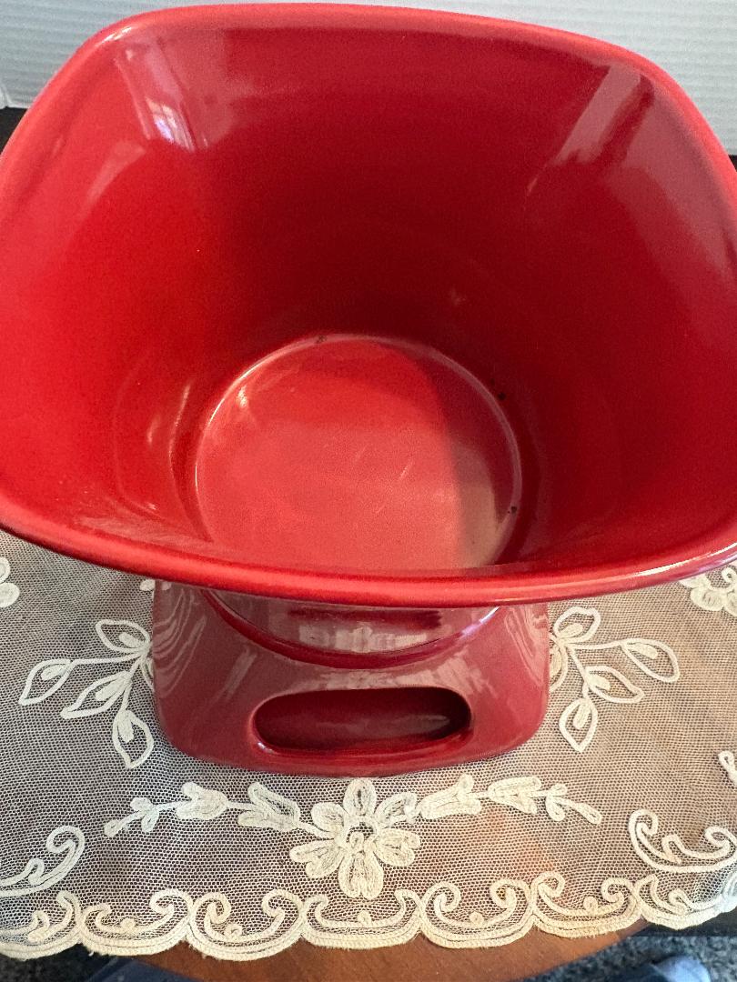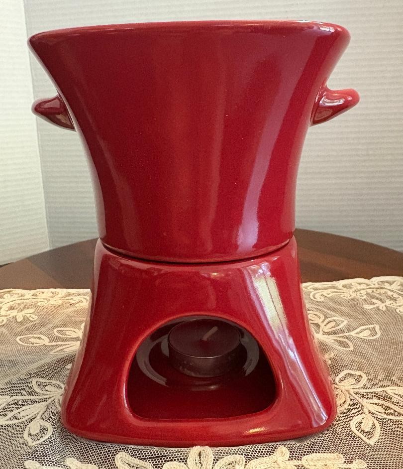 Elevate your dining experience with this stunning Bonjour for WIlliams-Sonoma Tealight Fondue Set in vibrant red. Crafted from high-quality ceramic, this fondue set includes a fondue pot and base, perfect for creating a cozy and intimate dining atmosphere. Ideal for both indoor and outdoor use, this fondue set is a must-have for any kitchen or dining room. Whether you’re hosting a dinner party or enjoying a romantic dinner for two, this fondue set is sure to impress. Its compact size of 6.5×6.5 inches makes it easy to transport and store, while its stylish design adds a touch of elegance to any table setting. So why wait? Add this gorgeous Bonjour for WIlliams-Sonoma Tealight Fondue Set to your collection today and start enjoying the perfect fondue experience! Could be used as a scented wax burner as well.